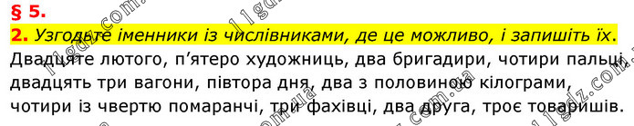 Узгодьте іменники із числівниками, де це можливо, і запишіть їх. Двадцяте лютого, п’ятеро художниць, два бригадири, чотири пальці, двадцять три вагони, півтора дня, два з половиною кілограми, чотири із чвертю помаранчі, три фахівці, два друга, троє товаришів.