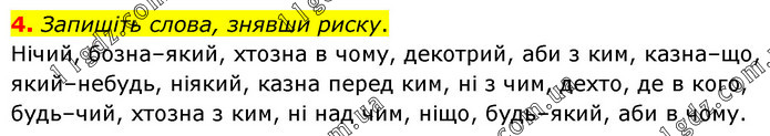 Запишіть слова, знявши риску. Нічий, бозна–який, хтозна в чому, декотрий, аби з ким, казна–що, який–небудь, ніякий, казна перед ким, ні з чим, дехто, де в кого, будь–чий, хтозна з ким, ні над чим, ніщо, будь–який, аби в чому.