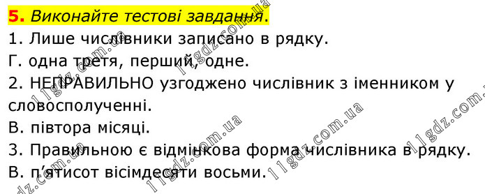 Виконайте тестові завдання. 1. Лише числівники записано в рядку. Г. одна третя, перший, одне. 2. НЕПРАВИЛЬНО узгоджено числівник з іменником у словосполученні. В. півтора місяці. 3. Правильною є відмінкова форма числівника в рядку. В. п’ятисот вісімдесяти восьми.
