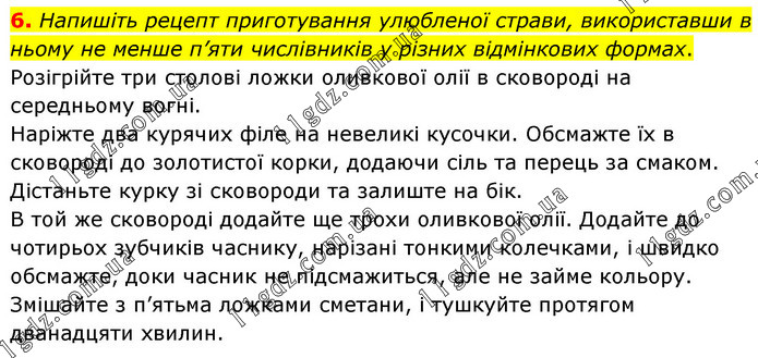 Напишіть рецепт приготування улюбленої страви, використавши в ньому не менше п’яти числівників у різних відмінкових формах. Розігрійте три столові ложки оливкової олії в сковороді на середньому вогні. Наріжте два курячих філе на невеликі кусочки. Обсмажте їх в сковороді до золотистої корки, додаючи сіль та перець за смаком. Дістаньте курку зі сковороди та залиште на бік. В той же сковороді додайте ще трохи оливкової олії. Додайте до чотирьох зубчиків часнику, нарізані тонкими колечками, і швидко обсмажте, доки часник не підсмажиться, але не займе кольору. Змішайте з п’ятьма ложками сметани, і тушкуйте протягом дванадцяти хвилин.