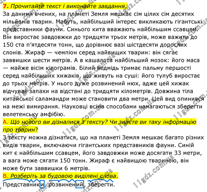 Прочитайте текст і виконайте завдання. За даними вчених, на планеті Земля мешкає сім цілих сім десятих мільйонів тварин. Мабуть, найбільший інтерес викликають гігантські представники фауни. Синього кита вважають найбільшим ссавцем. Він виростає завдовжки до тридцяти трьох метрів, може важити до 150 ста п’ятдесяти тонн, що дорівнює вазі шістдесяти дорослих слонів. Жираф — чемпіон серед найвищих тварин: він сягає заввишки шести метрів. А в кашалота найбільший мозок: його маса — майже вісім кілограмів. Білий ведмідь тримає пальму першості серед найбільших хижаків, що живуть на суші: його тулуб виростає до трьох метрів. У нього дуже розвинений нюх, адже цей хижак відчуває запахи на відстані до тридцяти кілометрів. Довжина тіла китайської саламандри може становити два метри. Цей вид опинився на межі вимирання. Науковці всіма способами намагаються зберегти велетенську амфібію. A. Що нового ви дізналися з тексту? Чи знаєте ви таку інформацію про тварин? З тексту можна дізнатися, що на планеті Земля мешкає багато різних видів тварин, включаючи гігантських представників фауни. Синій кит є найбільшим ссавцем, його завдовжки може досягати 33 метри, а вага може сягати 150 тонн. Жираф є найвищою твариною, він може бути заввишки 6 метрів. B. Розберіть за будовою виділені слова. Представники, розвинений, зберегти.