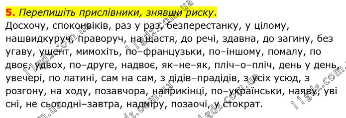 Перепишіть прислівники, знявши риску. Досхочу, споконвіків, раз у раз, безперестанку, у цілому, нашвидкуруч, праворуч, на щастя, до речі, здавна, до загину, без угаву, ущент, мимохіть, по–французьки, по–іншому, помалу, по двоє, удвох, по–друге, надвоє, як–не–як, пліч–о–пліч, день у день, увечері, по латині, сам на сам, з дідів–прадідів, з усіх усюд, з розгону, на ходу, позавчора, наприкінці, по–українськи, наяву, уві сні, не сьогодні–завтра, надміру, позаочі, у стократ.