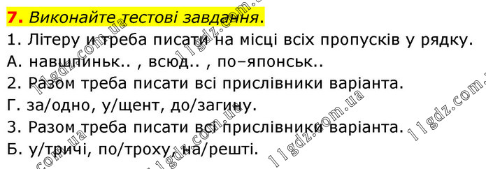 Виконайте тестові завдання. 1. Літеру и треба писати на місці всіх пропусків у рядку. А. навшпиньк.. , всюд.. , по–японськ.. 2. Разом треба писати всі прислівники варіанта. Г. за/одно, у/щент, до/загину. 3. Разом треба писати всі прислівники варіанта. Б. у/тричі, по/троху, на/решті.