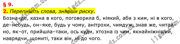 § 9. 2. Перепишіть слова, знявши риску. Бозна–де, казна в кого, поговорила б, ніякий, аби з ким, ні в кого, де–небудь, он–яке, будь у чому, анітрохи, чимдуж, знав же, читай–но, як–от, прийшла–таки, ось куди, хтозна із чим, якнайніжніший, наврядчи, щомиті, таки він, ні до чого.