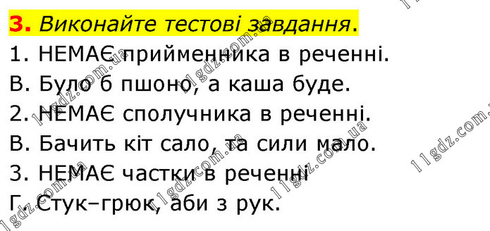 Виконайте тестові завдання. 1. НЕМАЄ прийменника в реченні. В. Було б пшоно, а каша буде. 2. НЕМАЄ сполучника в реченні. В. Бачить кіт сало, та сили мало. 3. НЕМАЄ частки в реченні Г. Стук–грюк, аби з рук.