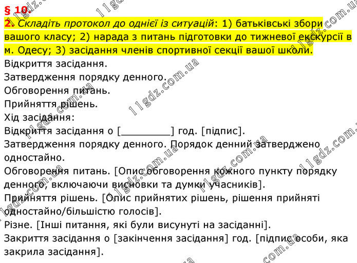Складіть протокол до однієї із ситуацій: 1) батьківські збори вашого класу; 2) нарада з питань підготовки до тижневої екскурсії в м. Одесу; 3) засідання членів спортивної секції вашої школи. Відкриття засідання. Затвердження порядку денного. Обговорення питань. Прийняття рішень. Хід засідання: Відкриття засідання о [________] год. [підпис]. Затвердження порядку денного. Порядок денний затверджено одностайно. Обговорення питань. [Опис обговорення кожного пункту порядку денного, включаючи висновки та думки учасників]. Прийняття рішень. [Опис прийнятих рішень, рішення прийняті одностайно/більшістю голосів]. Різне. [Інші питання, які були висунуті на засіданні]. Закриття засідання о [закінчення засідання] год. [підпис особи, яка закрила засідання].