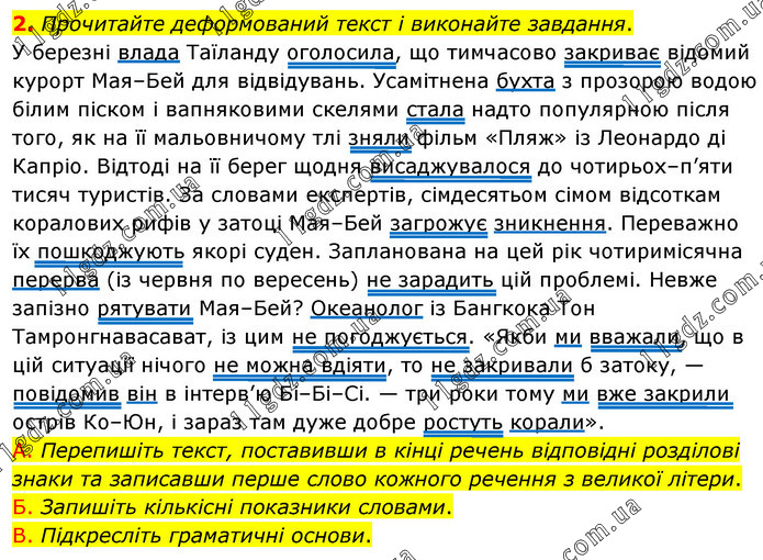Прочитайте деформований текст і виконайте завдання. У березні влада Таїланду оголосила, що тимчасово закриває відомий курорт Мая–Бей для відвідувань. Усамітнена бухта з прозорою водою білим піском і вапняковими скелями стала надто популярною після того, як на її мальовничому тлі зняли фільм «Пляж» із Леонардо ді Капріо. Відтоді на її берег щодня висаджувалося до чотирьох–п’яти тисяч туристів. За словами експертів, сімдесятьом сімом відсоткам коралових рифів у затоці Мая–Бей загрожує зникнення. Переважно їх пошкоджують якорі суден. Запланована на цей рік чотиримісячна перерва (із червня по вересень) не зарадить цій проблемі. Невже запізно рятувати Мая–Бей? Океанолог із Бангкока Тон Тамронгнавасават, із цим не погоджується. «Якби ми вважали, що в цій ситуації нічого не можна вдіяти, то не закривали б затоку, — повідомив він в інтерв’ю Бі–Бі–Сі. — три роки тому ми вже закрили острів Ко–Юн, і зараз там дуже добре ростуть корали». A. Перепишіть текст, поставивши в кінці речень відповідні розділові знаки та записавши перше слово кожного речення з великої літери. Б. Запишіть кількісні показники словами. B. Підкресліть граматичні основи.