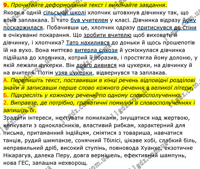 Прочитайте деформований текст і виконайте завдання. Якось в одній сільській школі хлопчик штовхнув дівчинку так, що вона заплакала. Її тато був учителем у класі. Дівчинка відразу йому поскаржилася. Побачивши це, хлопчик одразу притиснувся до стіни в очікуванні покарання. Що зробити вчителю щоб виховати й дівчинку, і хлопчика? Тато нахилився до доньки й щось прошепотів їй на вухо. Вона миттєво витерла сльози й усміхнулася дівчинка підійшла до хлопчика, котрий її образив, і простягла йому долоню, у якій лежали цукерки. Він довго дивився на цукерки, на дівчинку й на вчителя. Потім узяв цукерки, відвернувся та заплакав. А. Перепишіть текст, поставивши в кінці речень відповідні розділові знаки й записавши перше слово кожного речення з великої літери. Б. Підкресліть у кожному реченні по одному словосполученню. 2. Виправте, де потрібно, граматичні помилки в словосполученнях і запишіть їх. Зрадити інтереси, нехтувати помилками, знущатися над жертвою, кепкувати з однокласників, властивий рибкам, характерний для письма, притаманний індійцям, сміятися з товариша, навчатися танців, рудий шимпанзе, сонячний Тбілісі, цікаве хобі, слабкий біль, неправильний дріб, високий ступінь, повновода Хуанхе, екзотичне Нікарагуа, далека Перу, довга вермішель, ефективний шампунь, нова ГЕС, запашна нехворощ.