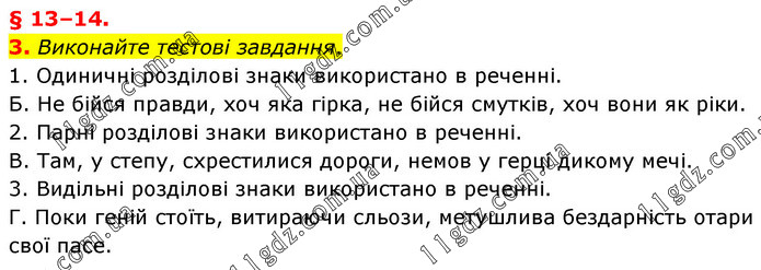 Виконайте тестові завдання. 1. Одиничні розділові знаки використано в реченні. Б. Не бійся правди, хоч яка гірка, не бійся смутків, хоч вони як ріки. 2. Парні розділові знаки використано в реченні. В. Там, у степу, схрестилися дороги, немов у герці дикому мечі. 3. Видільні розділові знаки використано в реченні. Г. Поки геній стоїть, витираючи сльози, метушлива бездарність отари свої пасе.