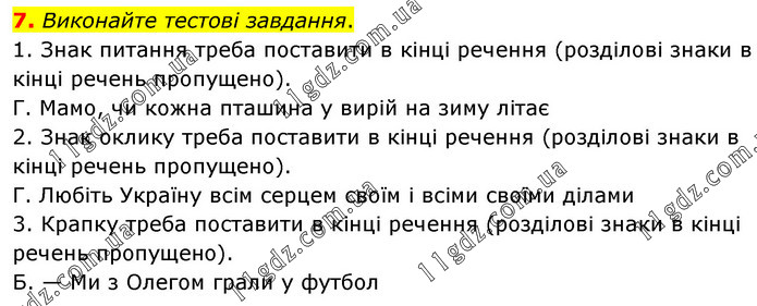 Виконайте тестові завдання. 1. Знак питання треба поставити в кінці речення (розділові знаки в кінці речень пропущено). Г. Мамо, чи кожна пташина у вирій на зиму літає 2. Знак оклику треба поставити в кінці речення (розділові знаки в кінці речень пропущено). Г. Любіть Україну всім серцем своїм і всіми своїми ділами 3. Крапку треба поставити в кінці речення (розділові знаки в кінці речень пропущено). Б. — Ми з Олегом грали у футбол