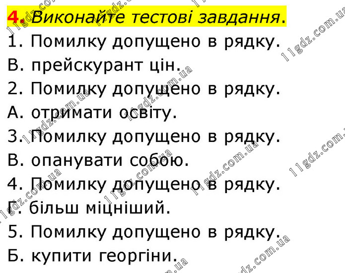Виконайте тестові завдання. 1. Помилку допущено в рядку. В. прейскурант цін. 2. Помилку допущено в рядку. А. отримати освіту. 3. Помилку допущено в рядку. В. опанувати собою. 4. Помилку допущено в рядку. Г. більш міцніший. 5. Помилку допущено в рядку. Б. купити георгіни.
