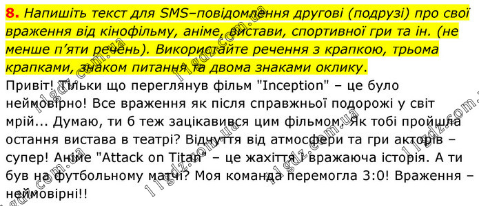 Напишіть текст для SMS–повідомлення другові (подрузі) про свої враження від кінофільму, аніме, вистави, спортивної гри та ін. (не менше п’яти речень). Використайте речення з крапкою, трьома крапками, знаком питання та двома знаками оклику. Привіт! Тільки що переглянув фільм "Inception" – це було неймовірно! Все враження як після справжньої подорожі у світ мрій... Думаю, ти б теж зацікавився цим фільмом. Як тобі пройшла остання вистава в театрі? Відчуття від атмосфери та гри акторів – супер! Аніме "Attack on Titan" – це жахіття і вражаюча історія. А ти був на футбольному матчі? Моя команда перемогла 3:0! Враження – неймовірні!!