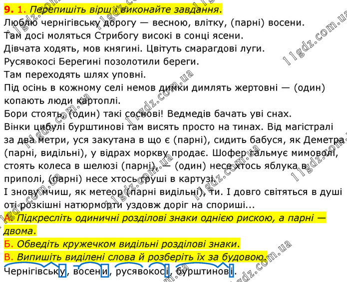 1. Перепишіть вірш і виконайте завдання. Люблю чернігівську дорогу — весною, влітку, (парні) восени. Там досі моляться Стрибогу високі в сонці ясени. Дівчата ходять, мов княгині. Цвітуть смарагдові луги. Русявокосі Берегині позолотили береги. Там переходять шлях уповні. Під осінь в кожному селі немов димки димлять жертовні — (один) копають люди картоплі. Бори стоять, (один) такі соснові! Ведмедів бачать уві снах. Вінки цибулі бурштинові там висять просто на тинах. Від магістралі за два метри, уся закутана в що є (парні), сидить бабуся, як Деметра (парні, видільні), у відрах моркву продає. Шофер гальмує мимоволі, стоять колеса в шелюзі (парні), — (один) несе хтось яблука в приполі, (парні) несе хтось груші в картузі. І знову мчиш, як метеор (парні видільні), ти. І довго світяться в душі оті розкішні натюрморти уздовж доріг на спориші... A. Підкресліть одиничні розділові знаки однією рискою, а парні — двома. Б. Обведіть кружечком видільні розділові знаки. B. Випишіть виділені слова й розберіть їх за будовою. Чернігівську, восени, русявокосі, бурштинові.