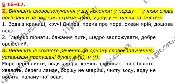 § 16–17. 2. Випишіть словосполучення у дві колонки: у першу — у яких слова пов’язані й за змістом, і граматично, у другу — тільки за змістом. 1. Вода з криниці, кручі Дніпра, поема про море, океан мрій, дощова вода. 2. Глибоко пірнати, бажання пити, щедро зволожувати, добре орошений. 3. Випишіть із кожного речення по одному словосполученню, уставивши пропущені букви е (є), и (ї). Море перепливти, води з моря, камінь пробиває, своє болото хвалить, береги ламає, борщу не звариш, чисту воду, воду не носять, каламутної води.