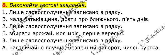 Виконайте тестові завдання. 1. Лише словосполучення записано в рядку. В. мала батьківщина, дбати про ближнього, п’ять днів. 2. Лише словосполучення записано в рядку. Б. збирати врожай, моя мрія, перше вересня. 3. Лише словосполучення записано в рядку. А. надзвичайно влучно, безпечний поворот, чиясь куртка.