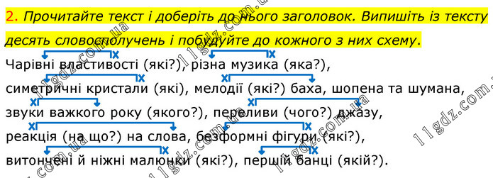 2. Прочитайте текст і доберіть до нього заголовок. Випишіть із тексту десять словосполучень і побудуйте до кожного з них схему. Чарівні властивості (які?), різна музика (яка?), симетричні кристали (які), мелодії (які?) баха, шопена та шумана, звуки важкого року (якого?), переливи (чого?) джазу, реакція (на що?) на слова, безформні фігури (які?), витончені й ніжні малюнки (які?), першій банці (якій?).