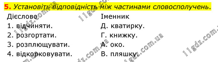 Установіть відповідність між частинами словосполучень. Дієслово 1. відчиняти. 2. розгортати. 3. розплющувати. 4. відкорковувати. Іменник Д. кватирку. Г. книжку. А. око. В. пляшку.