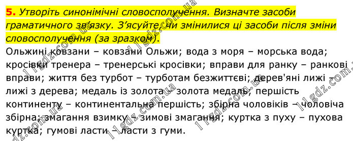 Утворіть синонімічні словосполучення. Визначте засоби граматичного зв’язку. З’ясуйте, чи змінилися ці засоби після зміни словосполучення (за зразком). Ольжині ковзани – ковзани Ольжи; вода з моря – морська вода; кросівки тренера – тренерські кросівки; вправи для ранку – ранкові вправи; життя без турбот – турботам безжиттєві; дерев'яні лижі – лижі з дерева; медаль із золота – золота медаль; першість континенту – континентальна першість; збірна чоловіків – чоловіча збірна; змагання взимку – зимові змагання; куртка з пуху – пухова куртка; гумові ласти – ласти з гуми.