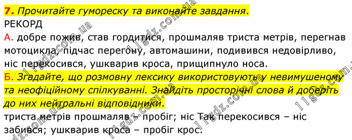 Прочитайте гумореску та виконайте завдання. РЕКОРД А. добре пожив, став гордитися, прошмаляв триста метрів, перегнав мотоцикла, підчас перегону, автомашини, подивився недовірливо, ніс перекосився, ушкварив кроса, прищипнуло носа. Б. Згадайте, що розмовну лексику використовують у невимушеному та неофіційному спілкуванні. Знайдіть просторічні слова й доберіть до них нейтральні відповідники. триста метрів прошмаляв – пробіг; ніс Так перекосився – ніс забився; ушкварив кроса – пробіг крос.