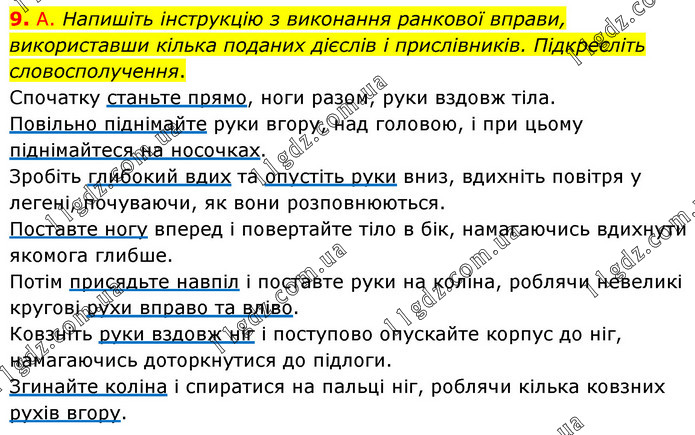 А. Напишіть інструкцію з виконання ранкової вправи, використавши кілька поданих дієслів і прислівників. Підкресліть словосполучення. Спочатку станьте прямо, ноги разом, руки вздовж тіла. Повільно піднімайте руки вгору, над головою, і при цьому піднімайтеся на носочках. Зробіть глибокий вдих та опустіть руки вниз, вдихніть повітря у легені, почуваючи, як вони розповнюються. Поставте ногу вперед і повертайте тіло в бік, намагаючись вдихнути якомога глибше. Потім присядьте навпіл і поставте руки на коліна, роблячи невеликі кругові рухи вправо та вліво. Ковзніть руки вздовж ніг і поступово опускайте корпус до ніг, намагаючись доторкнутися до підлоги. Згинайте коліна і спиратися на пальці ніг, роблячи кілька ковзних рухів вгору.