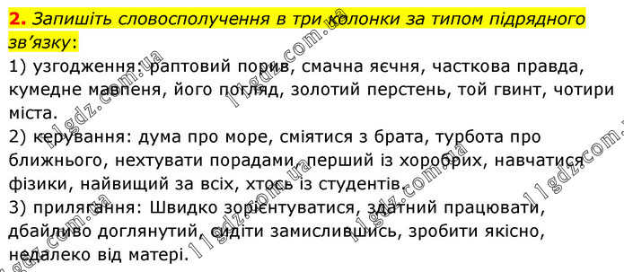 Запишіть словосполучення в три колонки за типом підрядного зв’язку: 1) узгодження: раптовий порив, смачна яєчня, часткова правда, кумедне мавпеня, його погляд, золотий перстень, той гвинт, чотири міста. 2) керування: дума про море, сміятися з брата, турбота про ближнього, нехтувати порадами, перший із хоробрих, навчатися фізики, найвищий за всіх, хтось із студентів. 3) прилягання: Швидко зорієнтуватися, здатний працювати, дбайливо доглянутий, сидіти замислившись, зробити якісно, недалеко від матері.