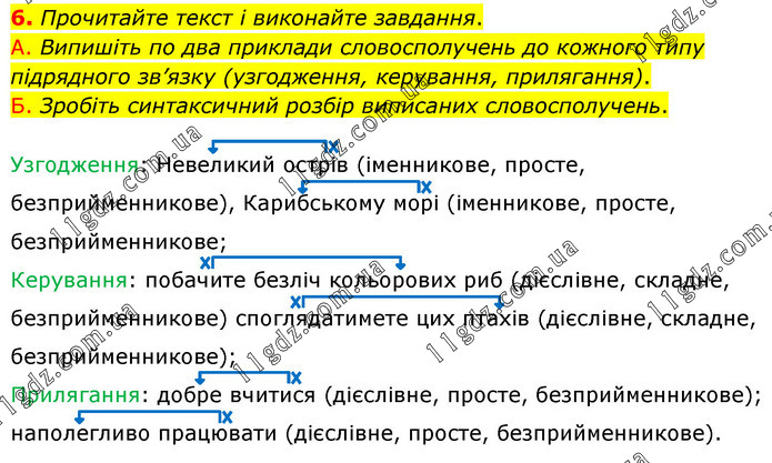 Прочитайте текст і виконайте завдання. А. Випишіть по два приклади словосполучень до кожного типу підрядного зв’язку (узгодження, керування, прилягання). Б. Зробіть синтаксичний розбір виписаних словосполучень. Узгодження: Невеликий острів (іменникове, просте, безприйменникове), Карибському морі (іменникове, просте, безприйменникове; Керування: побачите безліч кольорових риб (дієслівне, складне, безприйменникове) споглядатимете цих птахів (дієслівне, складне, безприйменникове); Прилягання: добре вчитися (дієслівне, просте, безприйменникове); наполегливо працювати (дієслівне, просте, безприйменникове).
