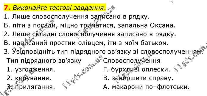 Виконайте тестові завдання. 1. Лише словосполучення записано в рядку. Б. піти з посади, міцно триматися, запальна Оксана. 2. Лише складні словосполучення записано в рядку. В. написаний простим олівцем, іти з моїм батьком. 3. Увідповідніть тип підрядного зв’язку зі словосполученням. Тип підрядного зв’язку 1. узгодження. 2. керування. 3. прилягання. Словосполучення Г. бурхливі оплески. В. завершити справу. А. макарони по–флотськи.
