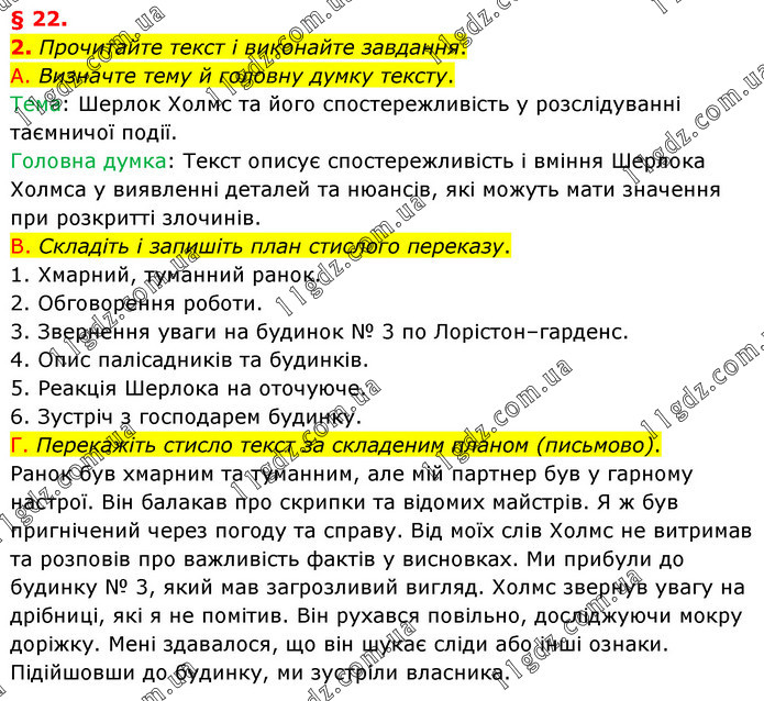 § 22. 2. Прочитайте текст і виконайте завдання. A. Визначте тему й головну думку тексту. Тема: Шерлок Холмс та його спостережливість у розслідуванні таємничої події. Головна думка: Текст описує спостережливість і вміння Шерлока Холмса у виявленні деталей та нюансів, які можуть мати значення при розкритті злочинів. B. Складіть і запишіть план стислого переказу. 1. Хмарний, туманний ранок. 2. Обговорення роботи. 3. Звернення уваги на будинок № 3 по Лорістон–гарденс. 4. Опис палісадників та будинків. 5. Реакція Шерлока на оточуюче. 6. Зустріч з господарем будинку. Г. Перекажіть стисло текст за складеним планом (письмово). Ранок був хмарним та туманним, але мій партнер був у гарному настрої. Він балакав про скрипки та відомих майстрів. Я ж був пригнічений через погоду та справу. Від моїх слів Холмс не витримав та розповів про важливість фактів у висновках. Ми прибули до будинку № 3, який мав загрозливий вигляд. Холмс звернув увагу на дрібниці, які я не помітив. Він рухався повільно, досліджуючи мокру доріжку. Мені здавалося, що він шукає сліди або інші ознаки. Підійшовши до будинку, ми зустріли власника.