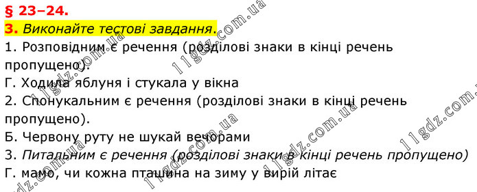 § 23–24. 3. Виконайте тестові завдання. 1. Розповідним є речення (розділові знаки в кінці речень пропущено). Г. Ходила яблуня і стукала у вікна 2. Спонукальним є речення (розділові знаки в кінці речень пропущено). Б. Червону руту не шукай вечорами 3. Питальним є речення (розділові знаки в кінці речень пропущено) Г. мамо, чи кожна пташина на зиму у вирій літає