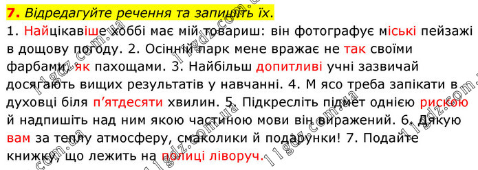 Відредагуйте речення та запишіть їх. 1. Найцікавіше хоббі має мій товариш: він фотографує міські пейзажі в дощову погоду. 2. Осінній парк мене вражає не так своїми фарбами, як пахощами. 3. Найбільш допитливі учні зазвичай досягають вищих результатів у навчанні. 4. М ясо треба запікати в духовці біля п’ятдесяти хвилин. 5. Підкресліть підмет однією рискою й надпишіть над ним якою частиною мови він виражений. 6. Дякую вам за теплу атмосферу, смаколики й подарунки! 7. Подайте книжку, що лежить на полиці ліворуч.