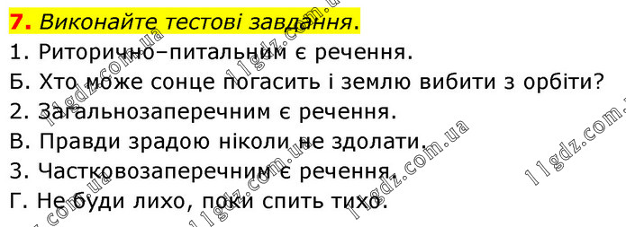 Виконайте тестові завдання. 1. Риторично–питальним є речення. Б. Хто може сонце погасить і землю вибити з орбіти? 2. Загальнозаперечним є речення. В. Правди зрадою ніколи не здолати. 3. Частковозаперечним є речення. Г. Не буди лихо, поки спить тихо.