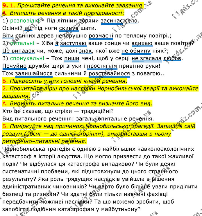 1. Прочитайте речення та виконайте завдання. А. Випишіть речення в такій послідовності: 1) розповідні – Під літніми зорями засинає село. Осінній ліс під ноги скинув шати. Віти сонних дерев непорушно розмаєні по теплому повітрі.; 2) питальні – Хіба я заступаю ваше сонце чи вдихаю ваше повітря? Це випадок чи, може, долі знак, якої вже не обмину ніяк?; 3) спонукальні – Тож пиши мені, щоб у серці не згасала любов. Почуймо дружби щирі згуки і простягнім привітно руки! Тож залишаймося сильними й розставаймося з повагою.. Б. Підкресліть у них головні члени речення. 2. Прочитайте вірш про наслідки Чорнобильської аварії та виконайте завдання. А. Випишіть питальне речення та визначте його вид. Хто це сказав, що стріхи — традиційні? Вид питального речення: загальнопитальне речення. Б. Поміркуйте над причиною Чорнобильської трагедії. Запишіть свій роздум (обсяг — до однієї сторінки), використавши в ньому риторично–питальні речення. Чорнобильська трагедія є однією з найбільших навколоекологічних катастроф в історії людства. Що могло призвести до такої жахливої події? Чи відбулася ця катастрофа випадково? Чи були деякі систематичні проблеми, які підштовхнули до цього страшного результату? Яка роль грядущих наслідків увійшла в рішення адміністративних чиновників? Чи варто було більше уваги приділити безпеці та ризикам? Чи здатні були тільки навчені фахівці передбачити можливі наслідки? Та що можемо зробити, щоб запобігти подібним катастрофам у майбутньому?