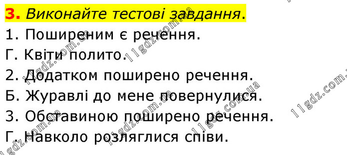 Виконайте тестові завдання. 1. Поширеним є речення. Г. Квіти полито. 2. Додатком поширено речення. Б. Журавлі до мене повернулися. 3. Обставиною поширено речення. Г. Навколо розляглися співи.