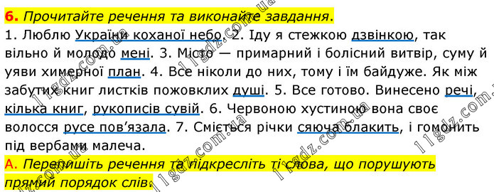 Прочитайте речення та виконайте завдання. 1. Люблю України коханої небо. 2. Іду я стежкою дзвінкою, так вільно й молодо мені. 3. Місто — примарний і болісний витвір, суму й уяви химерної план. 4. Все ніколи до них, тому і їм байдуже. Як між забутих книг листків пожовклих душі. 5. Все готово. Винесено речі, кілька книг, рукописів сувій. 6. Червоною хустиною вона своє волосся русе пов’язала. 7. Сміється річки сяюча блакить, і гомонить під вербами малеча. A. Перепишіть речення та підкресліть ті слова, що порушують прямий порядок слів.