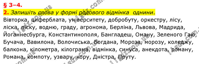 § 3–4. 2. Запишіть слова у формі родового відмінка однини. Вівторка, циферблата, університету, добробуту, оркестру, лісу, ліска, піску, водню, граду, агронома, Берліна, Львова, Мадрида, Йоганнесбурга, Константинополя, Бангладеш, Оману, Зеленого Гаю, Бучача, Вавилона, Волочиська, Богдана, Мороза, морозу, коледжу, балкона, кілометра, кілограма, відмінка, синуса, анекдота, роману, Романа, компоту, узвару, кору, Дністра, Пруту.