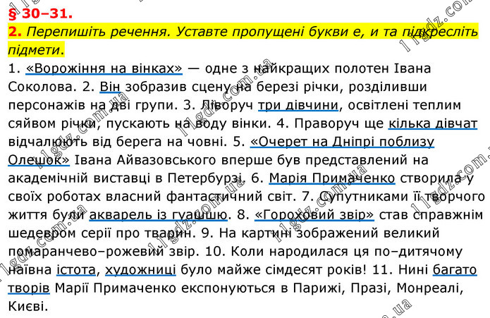 § 30–31. 2. Перепишіть речення. Уставте пропущені букви е, и та підкресліть підмети. 1. «Ворожіння на вінках» — одне з найкращих полотен Івана Соколова. 2. Він зобразив сцену на березі річки, розділивши персонажів на дві групи. 3. Ліворуч три дівчини, освітлені теплим сяйвом річки, пускають на воду вінки. 4. Праворуч ще кілька дівчат відчалюють від берега на човні. 5. «Очерет на Дніпрі поблизу Олешок» Івана Айвазовського вперше був представлений на академічній виставці в Петербурзі. 6. Марія Примаченко створила у своїх роботах власний фантастичний світ. 7. Супутниками її творчого життя були акварель із гуашшю. 8. «Гороховий звір» став справжнім шедевром серії про тварин. 9. На картині зображений великий помаранчево–рожевий звір. 10. Коли народилася ця по–дитячому наївна істота, художниці було майже сімдесят років! 11. Нині багато творів Марії Примаченко експонуються в Парижі, Празі, Монреалі, Києві.