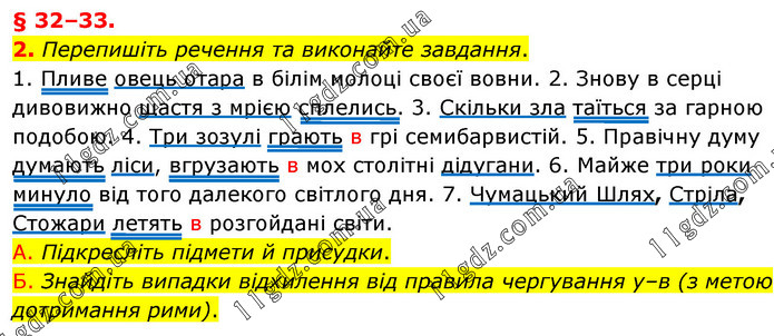 § 32–33. 2. Перепишіть речення та виконайте завдання. 1. Пливе овець отара в білім молоці своєї вовни. 2. Знову в серці дивовижно щастя з мрією сплелись. 3. Скільки зла таїться за гарною подобою. 4. Три зозулі грають в грі семибарвистій. 5. Правічну думу думають ліси, вгрузають в мох столітні дідугани. 6. Майже три роки минуло від того далекого світлого дня. 7. Чумацький Шлях, Стріла, Стожари летять в розгойдані світи. А. Підкресліть підмети й присудки. Б. Знайдіть випадки відхилення від правила чергування у–в (з метою дотримання рими).