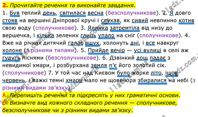 Прочитайте речення та виконайте завдання. 1. Був теплий день, світилася весна (безсполучникове). 2. Я довго стояв на вершині Дніпрової кручі і слухав, як сивий невпинно котив свою воду (сполучникове). 3. Ялинка затремтіла від низу до вершечка, і кілька зелених глиць упало на сніг (сполучникове). 4. Вже на річках дитячий галас вщух, холонуть дні, і все навкруг холоне (з різними типами). 5. Прийде вечір — усі вулиці в селі аж гудуть піснями (безсполучникове). 6. Дзвінкий дощ падає з невидимої хмари, і розбурхана земля п’є його золотий сік. (сполучникове) 7. У той час над Києвом було жарке літо, ішов червень, і важкі темні хмари мало не щовечора збиралися на небі (з різними видами зв’язку). А. Перепишіть речення та підкресліть у них граматичні основи. Б. Визначте вид кожного складного речення — сполучникове, безсполучникове чи з різними видами зв’язку.