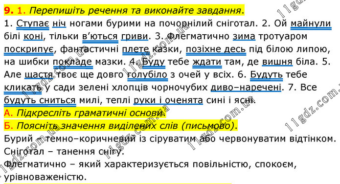1. Перепишіть речення та виконайте завдання. 1. Ступає ніч ногами бурими на почорнілий сніготал. 2. Ой майнули білі коні, тільки в’ються гриви. 3. Флегматично зима тротуаром поскрипує, фантастичні плете казки, позіхне десь під білою липою, на шибки покладе мазки. 4. Буду тебе ждати там, де вишня біла. 5. Але щастя твоє ще довго голубіло з очей у всіх. 6. Будуть тебе кликать у сади зелені хлопців чорночубих диво–наречені. 7. Все будуть сниться милі, теплі руки і оченята сині і ясні. А. Підкресліть граматичні основи. Б. Поясніть значення виділених слів (письмово). Бурий – темно–коричневий із сіруватим або червонуватим відтінком. Сніготал – танення снігу. Флегматично – який характеризується повільністю, спокоєм, урівноваженістю.
