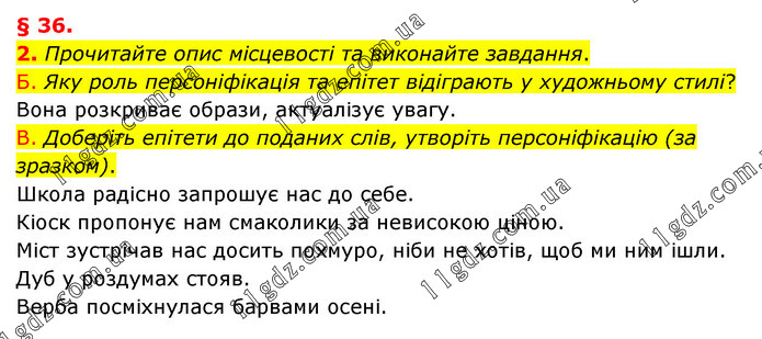 Прочитайте опис місцевості та виконайте завдання. Б. Яку роль персоніфікація та епітет відіграють у художньому стилі? Вона розкриває образи, актуалізує увагу. B. Доберіть епітети до поданих слів, утворіть персоніфікацію (за зразком). Школа радісно запрошує нас до себе. Кіоск пропонує нам смаколики за невисокою ціною. Міст зустрічав нас досить похмуро, ніби не хотів, щоб ми ним ішли. Дуб у роздумах стояв. Верба посміхнулася барвами осені.