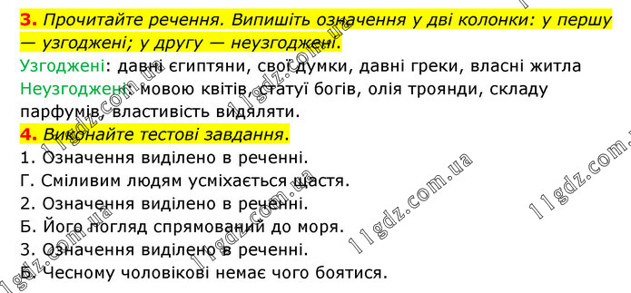 3. Прочитайте речення. Випишіть означення у дві колонки: у першу — узгоджені; у другу — неузгоджені. Узгоджені: давні єгиптяни, свої думки, давні греки, власні житла Неузгоджені: мовою квітів, статуї богів, олія троянди, складу парфумів, властивість видяляти. 4. Виконайте тестові завдання. 1. Означення виділено в реченні. Г. Сміливим людям усміхається щастя. 2. Означення виділено в реченні. Б. Його погляд спрямований до моря. 3. Означення виділено в реченні. Б. Чесному чоловікові немає чого боятися.