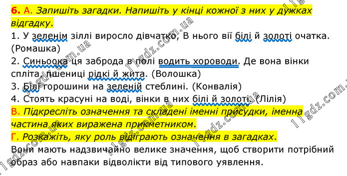 А. Запишіть загадки. Напишіть у кінці кожної з них у дужках відгадку. 1. У зеленім зіллі виросло дівчатко, В нього вії білі й золоті очатка. (Ромашка) 2. Синьоока ця заброда в полі водить хороводи. Де вона вінки спліта, пшениці рідкі й жита. (Волошка) 3. Білі горошини на зеленій стеблині. (Конвалія) 4. Стоять красуні на воді, вінки в них білі й золоті. (Лілія) В. Підкресліть означення та складені іменні присудки, іменна частина яких виражена прикметником. Г. Розкажіть, яку роль відіграють означення в загадках. Вони мають надзвичайно велике значення, щоб створити потрібний образ або навпаки відволікти від типового уявлення.