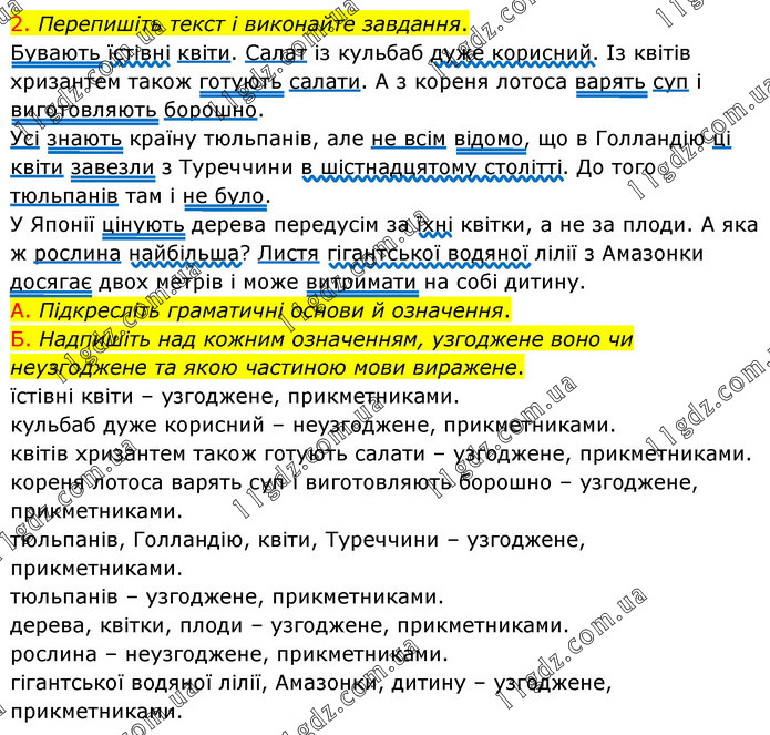 Перепишіть текст і виконайте завдання. Бувають їстівні квіти. Салат із кульбаб дуже корисний. Із квітів хризантем також готують салати. А з кореня лотоса варять суп і виготовляють борошно. Усі знають країну тюльпанів, але не всім відомо, що в Голландію ці квіти завезли з Туреччини в шістнадцятому столітті. До того тюльпанів там і не було. У Японії цінують дерева передусім за їхні квітки, а не за плоди. А яка ж рослина найбільша? Листя гігантської водяної лілії з Амазонки досягає двох метрів і може витримати на собі дитину. А. Підкресліть граматичні основи й означення. Б. Надпишіть над кожним означенням, узгоджене воно чи неузгоджене та якою частиною мови виражене. їстівні квіти – узгоджене, прикметниками. кульбаб дуже корисний – неузгоджене, прикметниками. квітів хризантем також готують салати – узгоджене, прикметниками. кореня лотоса варять суп і виготовляють борошно – узгоджене, прикметниками. тюльпанів, Голландію, квіти, Туреччини – узгоджене, прикметниками. тюльпанів – узгоджене, прикметниками. дерева, квітки, плоди – узгоджене, прикметниками. рослина – неузгоджене, прикметниками. гігантської водяної лілії, Амазонки, дитину – узгоджене, прикметниками.