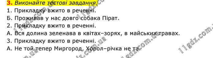 Виконайте тестові завдання. 1. Прикладку вжито в реченні. Б. Проживав у нас довго собака Пірат. 2. Прикладку вжито в реченні. А. Вся долина зеленава в квітах–зорях, в майських травах. 3. Прикладку вжито в реченні. А. Не той тепер Миргород, Хорол–річка не та.
