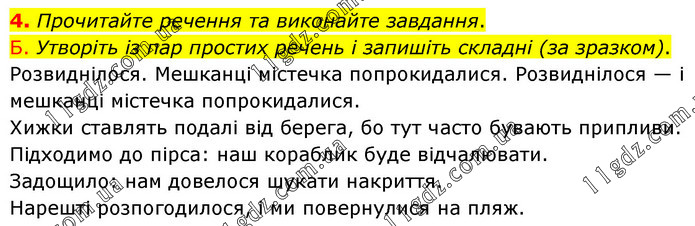 Прочитайте речення та виконайте завдання. Б. Утворіть із пар простих речень і запишіть складні (за зразком). Розвиднілося. Мешканці містечка попрокидалися. Розвиднілося — і мешканці містечка попрокидалися. Хижки ставлять подалі від берега, бо тут часто бувають припливи. Підходимо до пірса: наш кораблик буде відчалювати. Задощило: нам довелося шукати накриття. Нарешті розпогодилося, і ми повернулися на пляж.