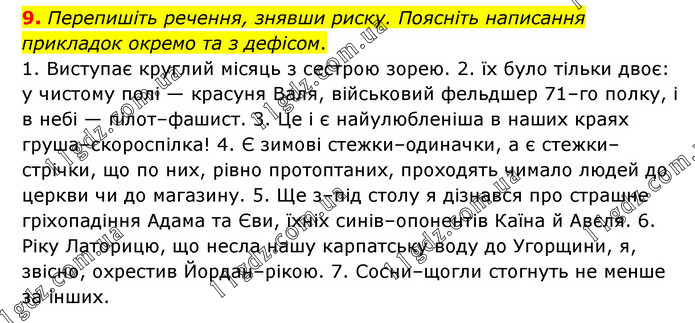 Перепишіть речення, знявши риску. Поясніть написання прикладок окремо та з дефісом. 1. Виступає круглий місяць з сестрою зорею. 2. їх було тільки двоє: у чистому полі — красуня Валя, військовий фельдшер 71–го полку, і в небі — пілот–фашист. 3. Це і є найулюбленіша в наших краях груша–скороспілка! 4. Є зимові стежки–одиначки, а є стежки–стрічки, що по них, рівно протоптаних, проходять чимало людей до церкви чи до магазину. 5. Ще з–під столу я дізнався про страшне гріхопадіння Адама та Єви, їхніх синів–опонентів Каїна й Авєля. 6. Ріку Латорицю, що несла нашу карпатську воду до Угорщини, я, звісно, охрестив Йордан–рікою. 7. Сосни–щогли стогнуть не менше за інших.