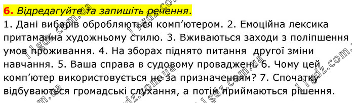 Відредагуйте та запишіть речення. 1. Дані виборів обробляються комп’ютером. 2. Емоційна лексика притаманна художньому стилю. 3. Вживаються заходи з поліпшення умов проживання. 4. На зборах піднято питання другої зміни навчання. 5. Ваша справа в судовому проваджені. 6. Чому цей комп’ютер використовується не за призначенням? 7. Спочатку відбуваються громадські слухання, а потім приймаються рішення.