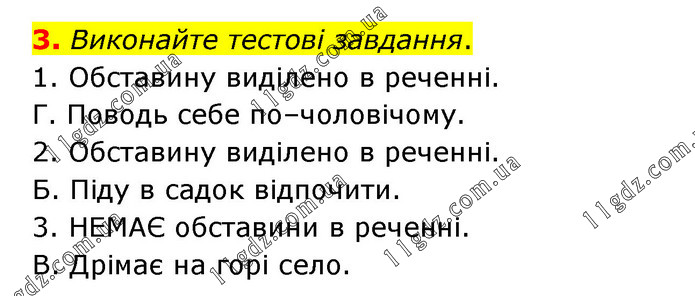 Виконайте тестові завдання. 1. Обставину виділено в реченні. Г. Поводь себе по–чоловічому. 2. Обставину виділено в реченні. Б. Піду в садок відпочити. 3. НЕМАЄ обставини в реченні. В. Дрімає на горі село.