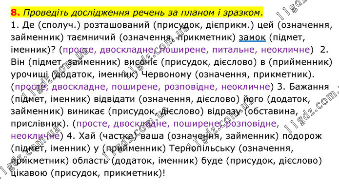 Проведіть дослідження речень за планом і зразком. 1. Де (сполуч.) розташований (присудок, дієприкм.) цей (означення, займенник) таємничий (означення, прикметник) замок (підмет, іменник)? (просте, двоскладне, поширене, питальне, неокличне) 2. Він (підмет, займенник) височіє (присудок, дієслово) в (прийменник) урочищі (додаток, іменник) Червоному (означення, прикметник). (просте, двоскладне, поширене, розповідне, неокличне) 3. Бажання (підмет, іменник) відвідати (означення, дієслово) його (додаток, займенник) виникає (присудок, дієслово) відразу (обставина, прислівник). (просте, двоскладне, поширене, розповідне, неокличне) 4. Хай (частка) ваша (означення, займенник) подорож (підмет, іменник) у (прийменник) Тернопільську (означення, прикметник) область (додаток, іменник) буде (присудок, дієслово) цікавою (присудок, прикметник)!