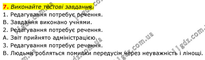Виконайте тестові завдання. 1. Редагування потребує речення. В. Завдання виконано учнями. 2. Редагування потребує речення. А. Звіт прийнято адміністрацією. 3. Редагування потребує речення. В. Людьми робляться помилки передусім через неуважність і лінощі.